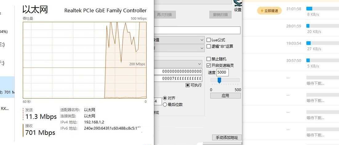 启动CE修改器,如图选择熟悉的进程,勾上右边的加速,填好倍数,享受飞一般速度!