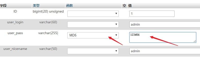 在users表中,会看到一个叫做user_pass的字段,这个就是密码存储的位置,不过它并不是我们的明文密码,而是采用加密存储的,所以我们要先把前边的函数选择MD5加密,后边的值中再填写自己需要修改的密码